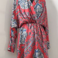 vestito corto, mini abito rosso corallo con fantasia colorata paisley o cashmere; modello con manica lunga a kimono, scoll...