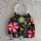 borsa nera a fiori, non conosco il materiale, forse stoffa. manico in plastica. penna per proporzioni. |