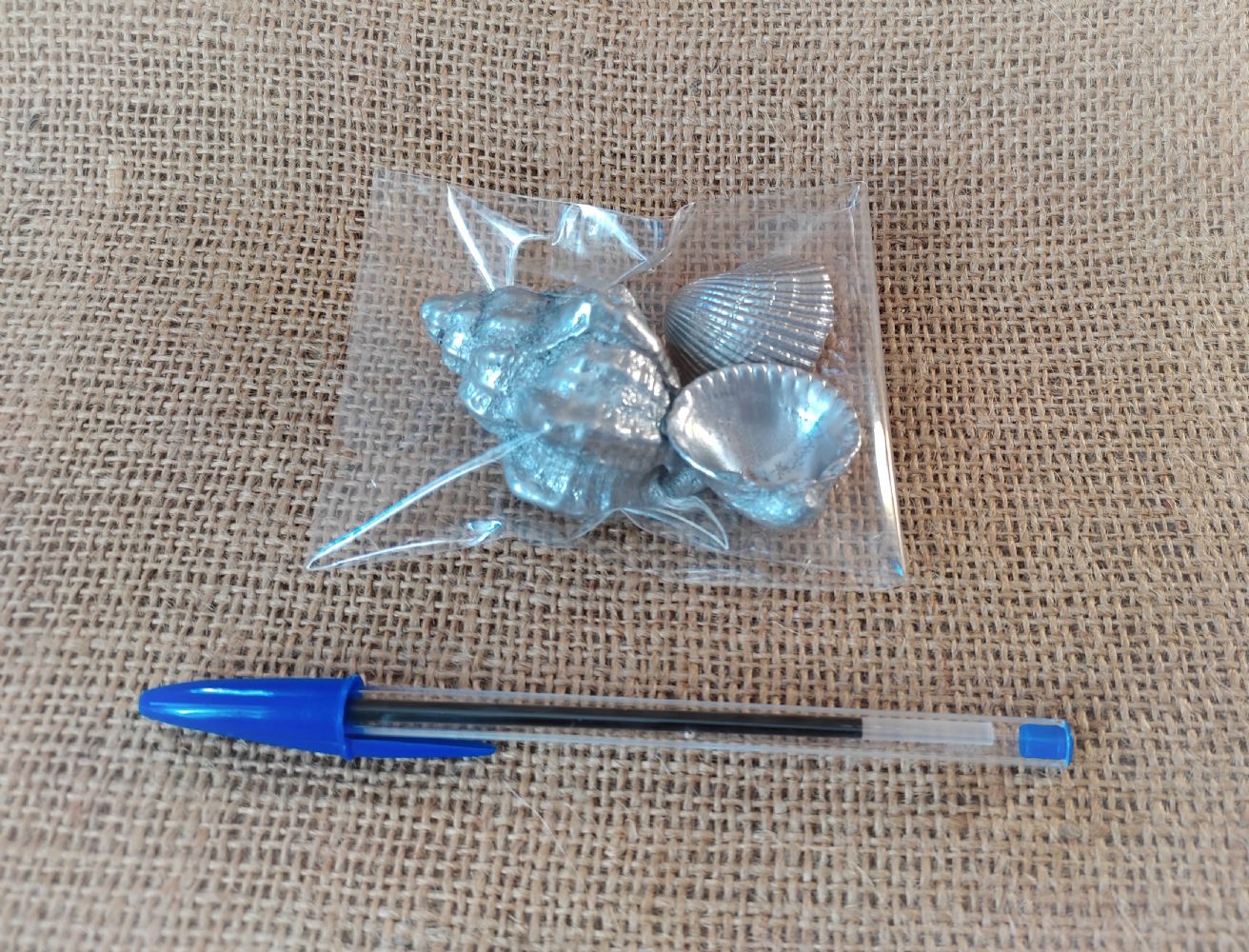 Descrizione:Tre conchiglie vere dipinte da me con colore argento/cromato. Mi sono avanzate da un lavoretto a tema natalizio.