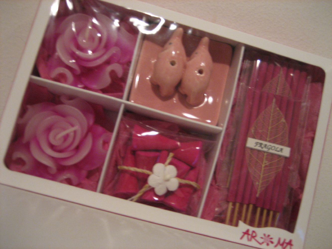 Set contenente 2 portaincensi rosa a forma di maialino, incenci bastoncino, incensi conetti, 2 candele a forma di rosa.