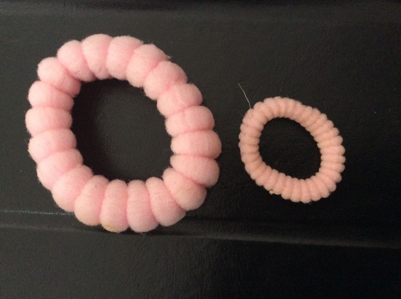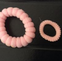 2 elastici per capelli rosa, uno più grande ed uno un po' più piccolo.