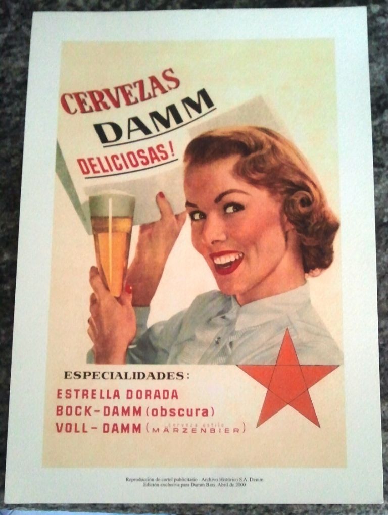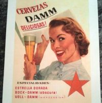 Riproduzione di un cartello pubblicitario della birra DAMM degli anni '50. Proveniente da Barcellona, direttamente dalla fabbrica Damm. Dimensioni medie, A4.