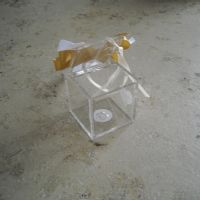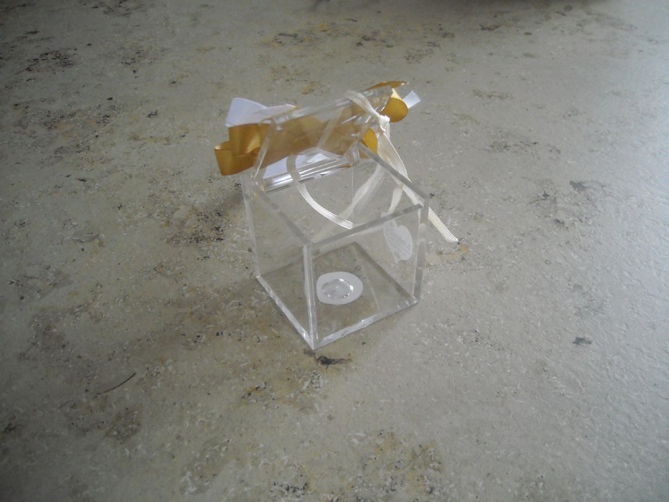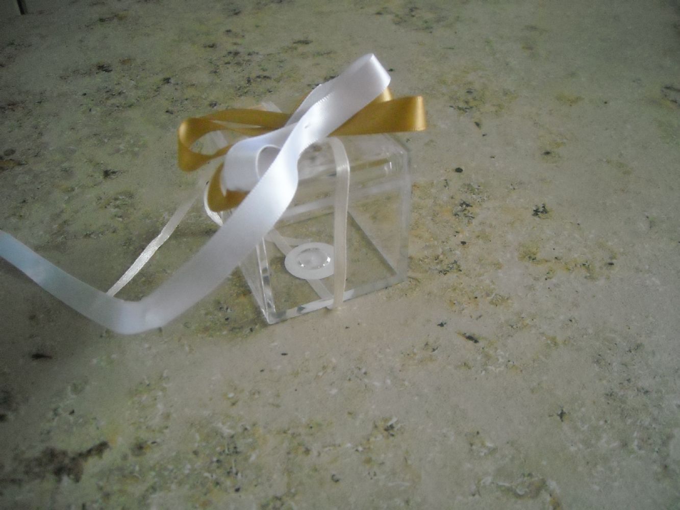 Regalo scatolina in plastica che conteneva i confetti di una bomboniera. Il fiocco è da ricreare. E'' un cubo di 5 cm di lato.