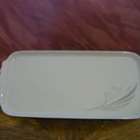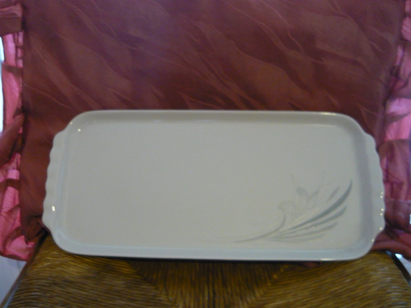 Descrizione:Vassoio in ceramica con decorazione a lato grigia e bianco , misura cm 35 X 16in fondo c' è scritto made in German Democratic Republic