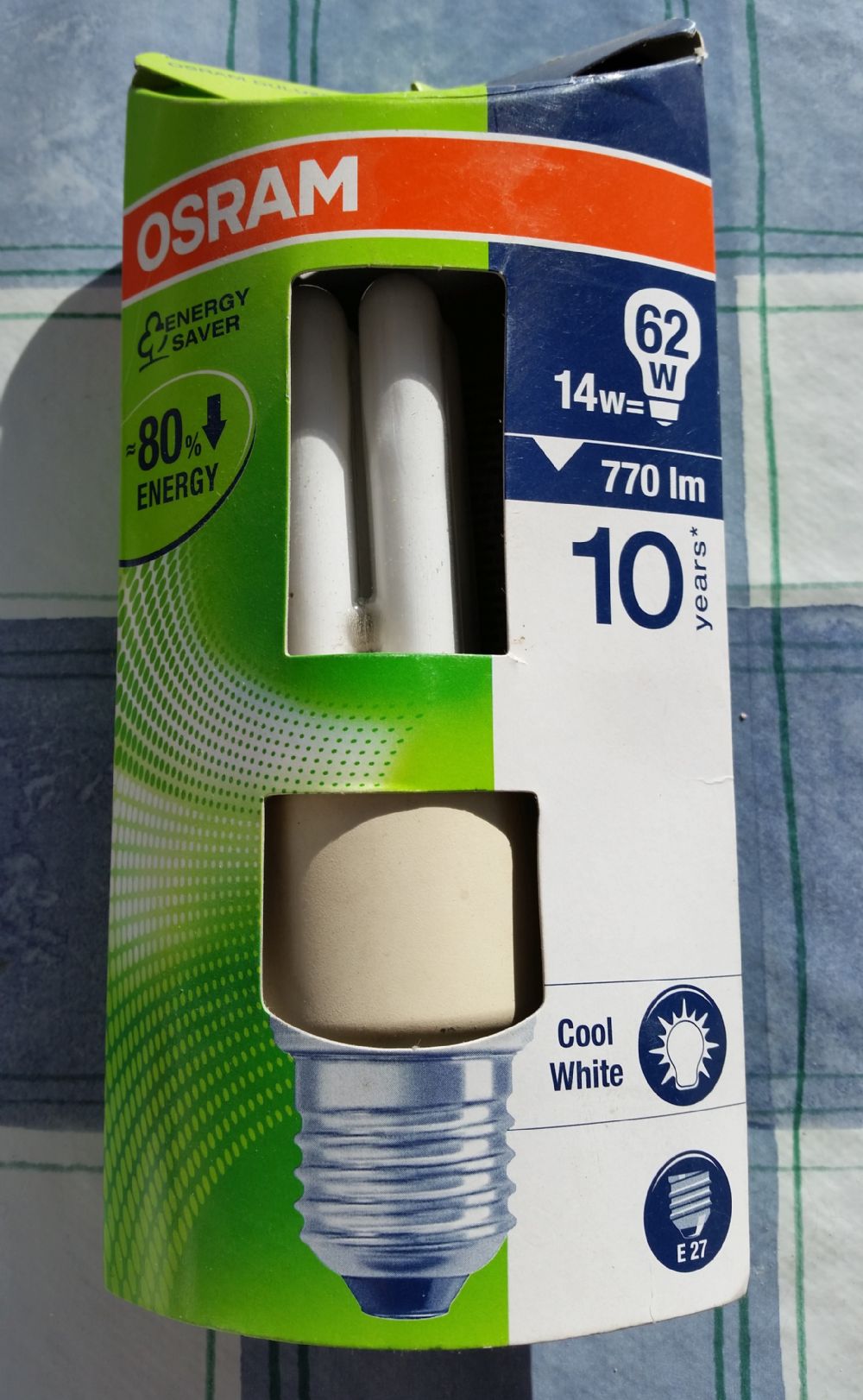 Descrizione:lampadina a risparmio energetico 14W = 62w a luce bianca OSRAM attacco E27