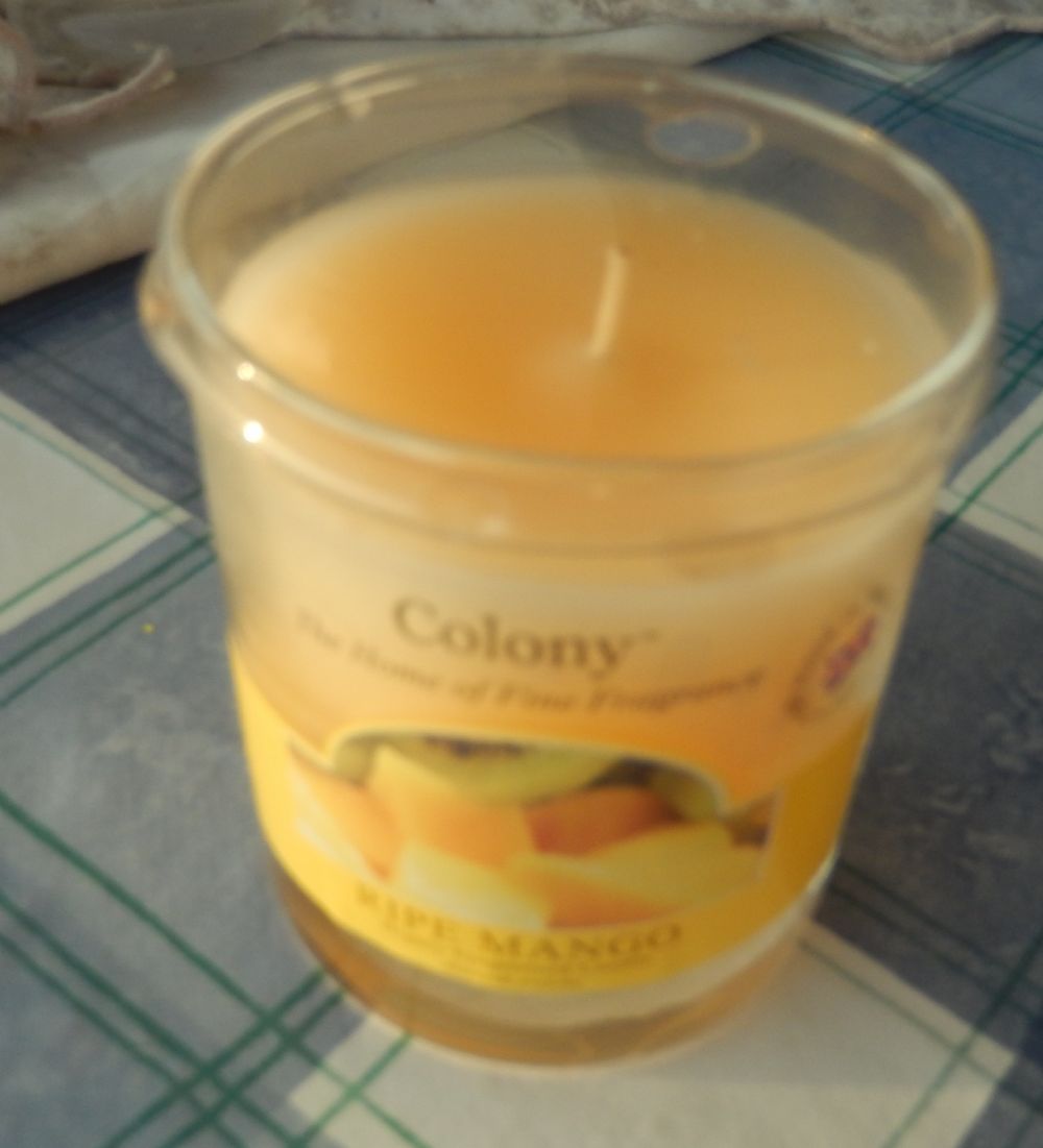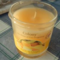 Descrizione:candela profumata Colony alla fragranza ripe mango in bicchiere con tappo salva profumo