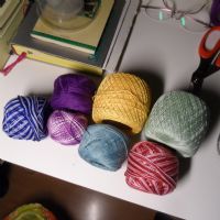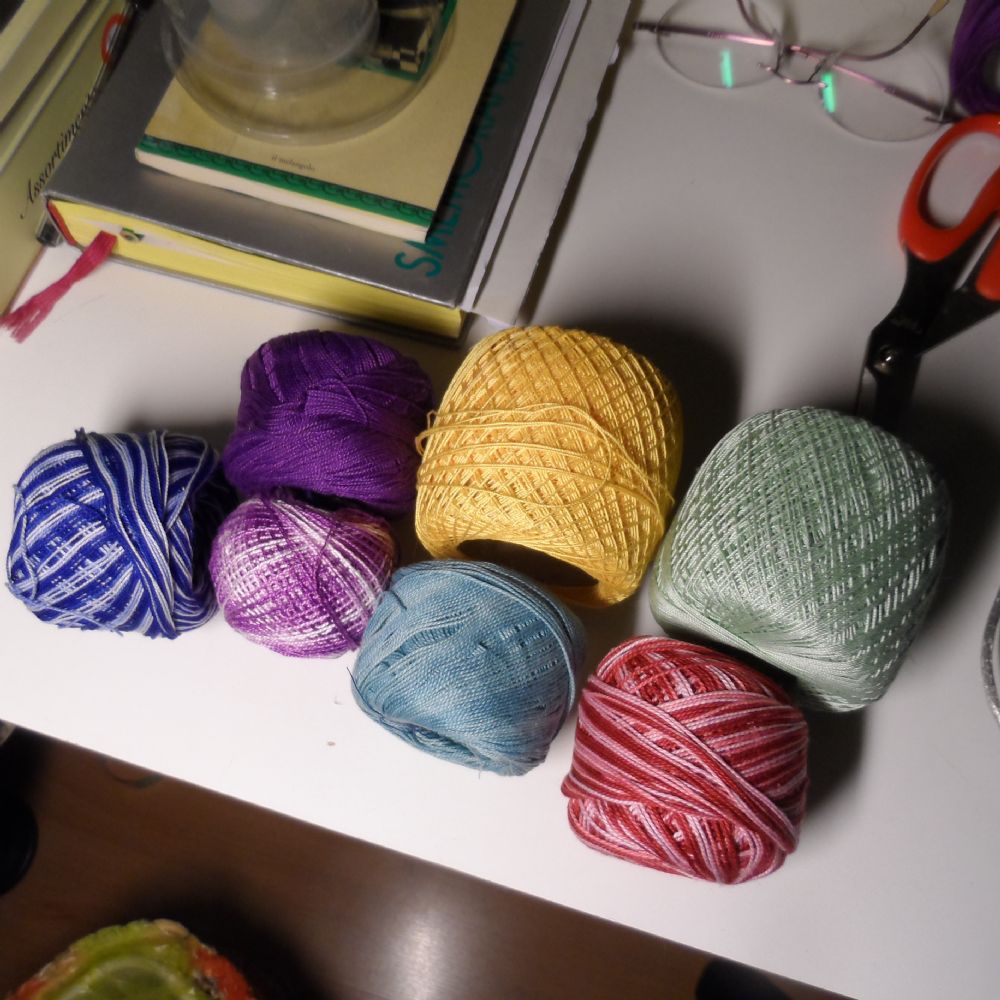 Descrizione:ecco qui quello che posso proporti domani ti fotografo meglio gli altri filati così puoi scegliere..poi mi spieghi come fai a misurare il filato...perchè se lo devo misurare diventa lunghetta ;)
