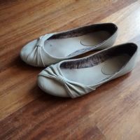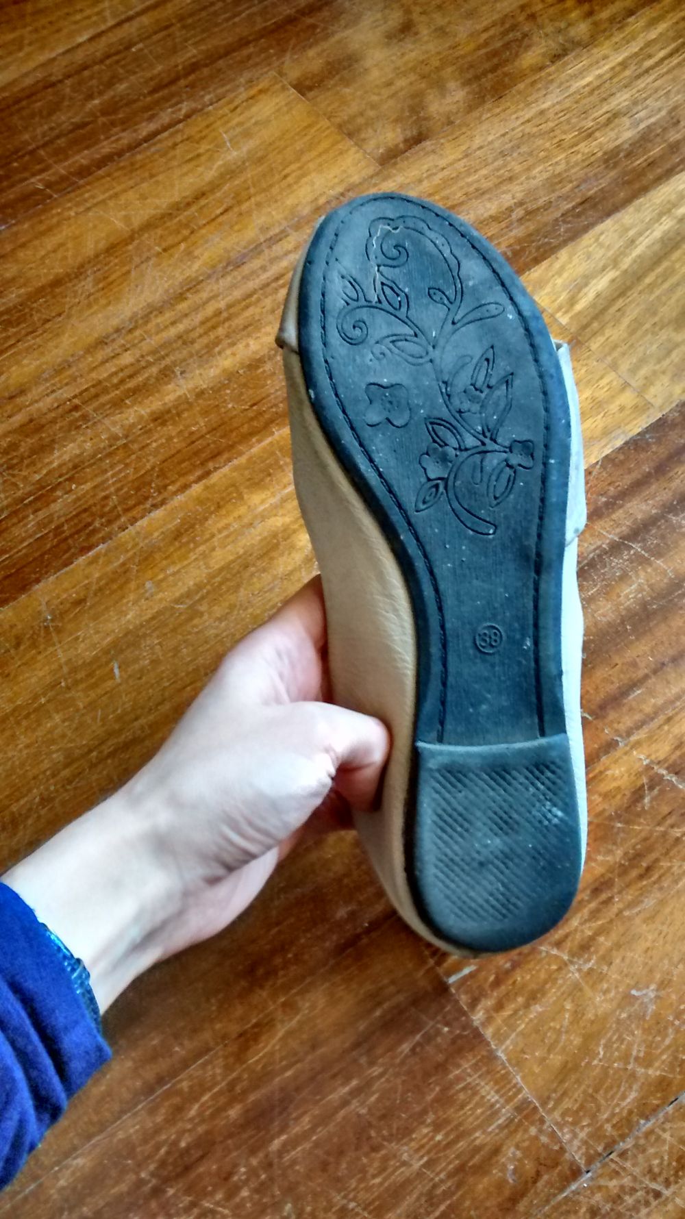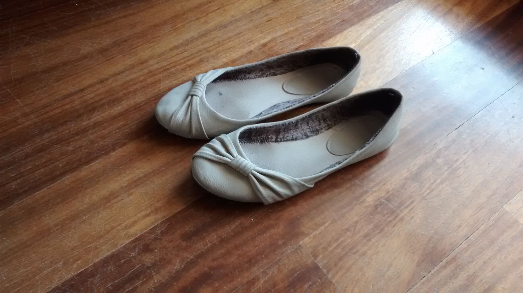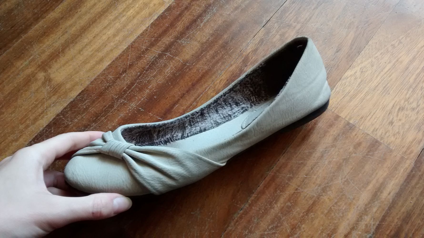 scarpe con qualche anno di vita, ma ancora in buone condizioni, suola perfetta in gomma, color beige con simil fiocco sul lato e interno morbido con finto pelo- pochissimo in realtà. Sono ottime in inverno. Non le uso mai, porto scarpe con più tacco.