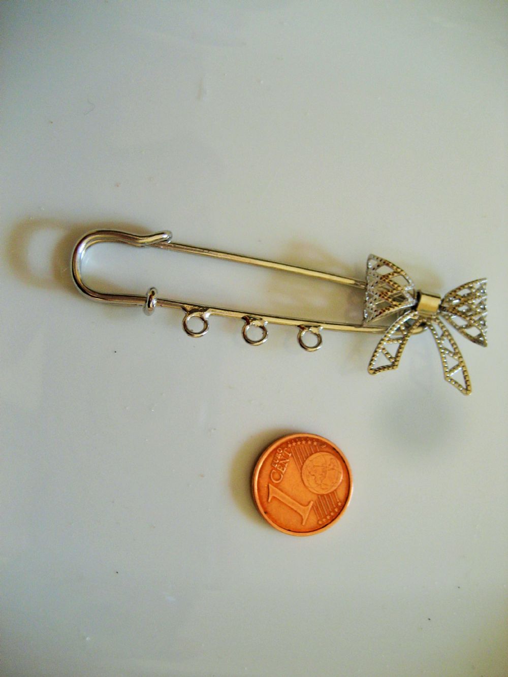 Descrizione:spilla con fiocchetto e 3 anellini per attaccate ciondoli,in metallo argentato