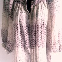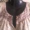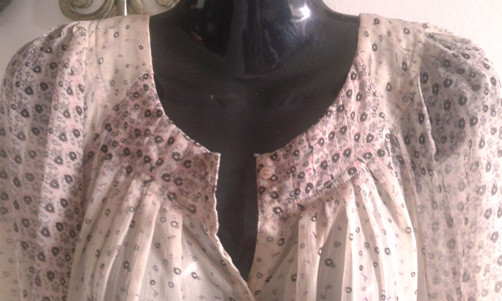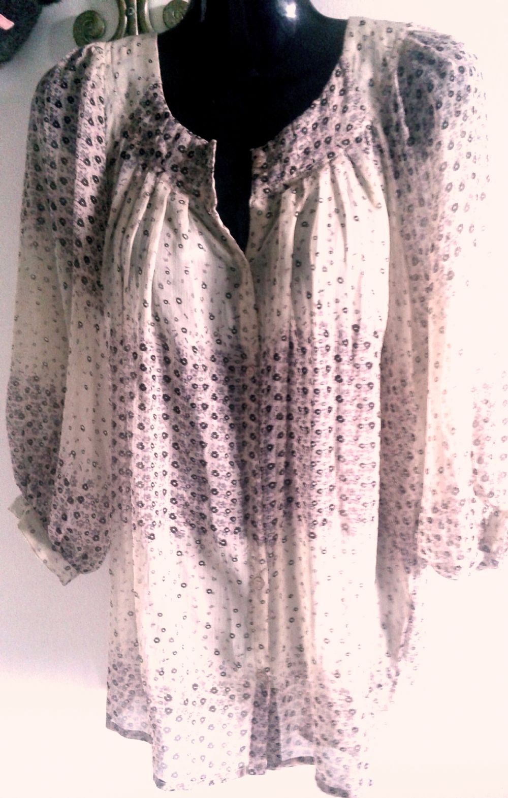Bellissima blusa, impalpabile, fondo beige con fiorellini lilla e neri