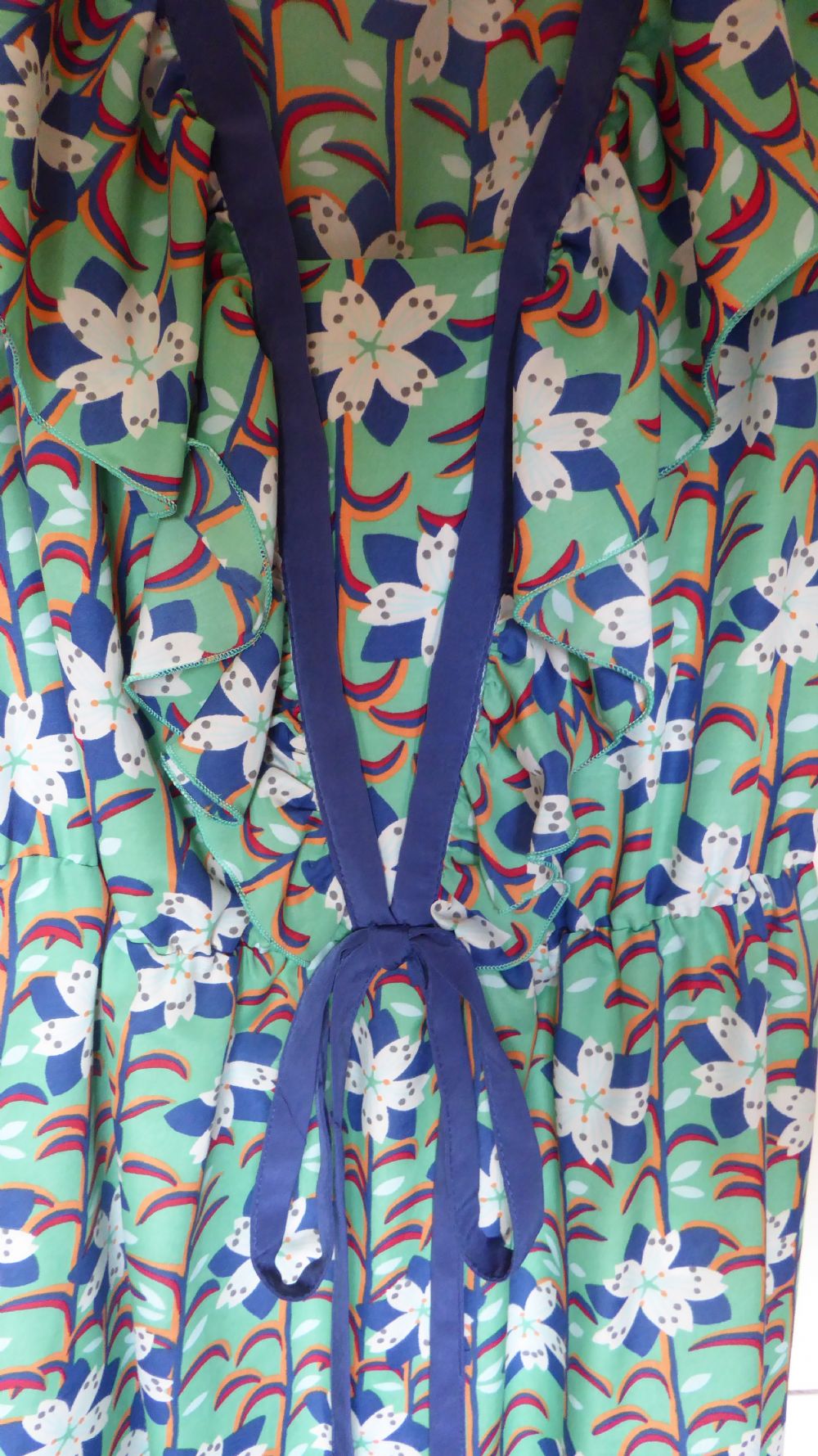 Descrizione:Abitino verde acqua con profili blu cobalto e fiori bianchi stilizzati