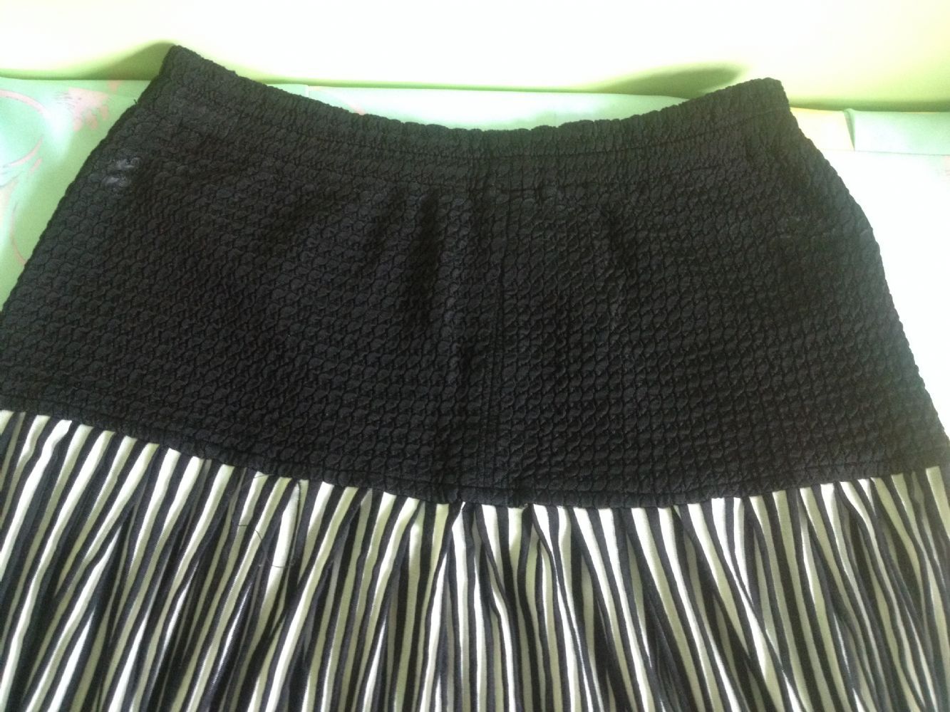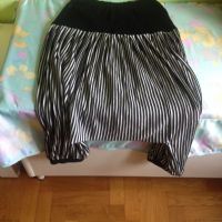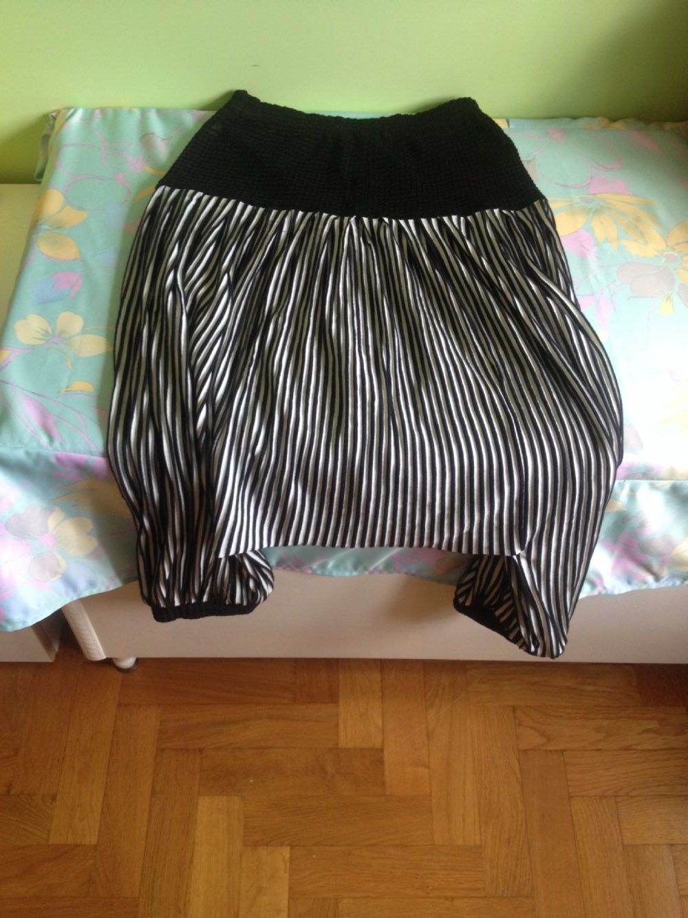 Descrizione:In vita ha una fascia in tessuto elasticizzato tinta nera che si ripete nei bordi elastici delle gambe.Ha il cavallo lento e basso chiuso come i modelli alla turca. E' a fantasia righe bianco e nera, molto lenta e comoda perciò adatta a varie taglie credo dalla 44 fino alla 48 possa andare. Possibilità di utilizzarla come vestito/tutina tirando su la fascia fino al seno portandola con il cavallo meno lento. E' molto carina, scambiata qui ma non mi sta bene!