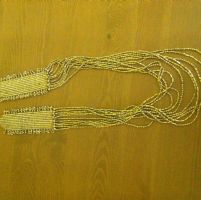 Ciao!! Il materiale delle perline non lo saprei dire.. Credo siano di "plastica".. O di una "lega leggera"..Ma non saprei sinceramente, hanno un bel effetto metallizzato/argentato.. La lunghezza: se la si allunga completamente e' circa 70 cm, ma è regolabile.