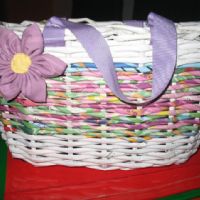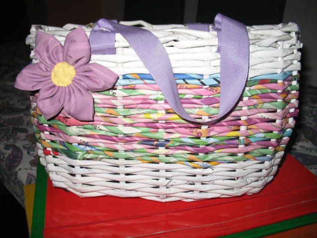 borsetta di carta intrecciata di rivista e depliants- fiore di stoffa realizzato a mano da recupero scarto industriale