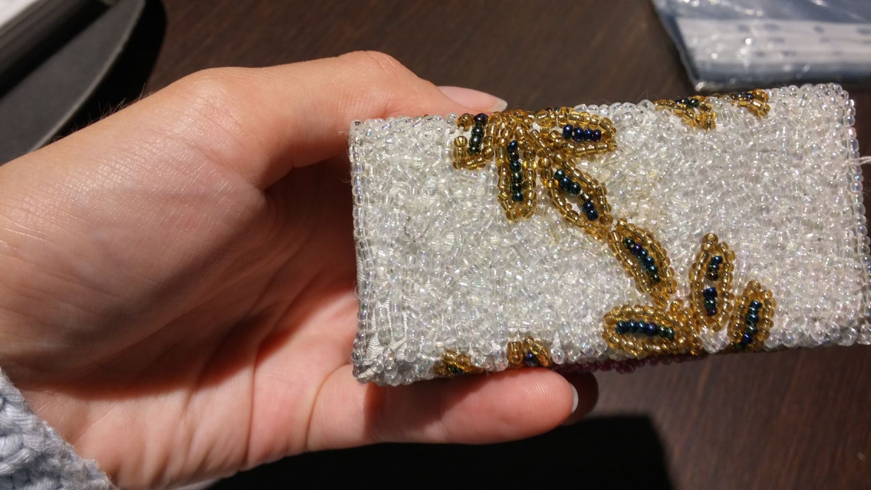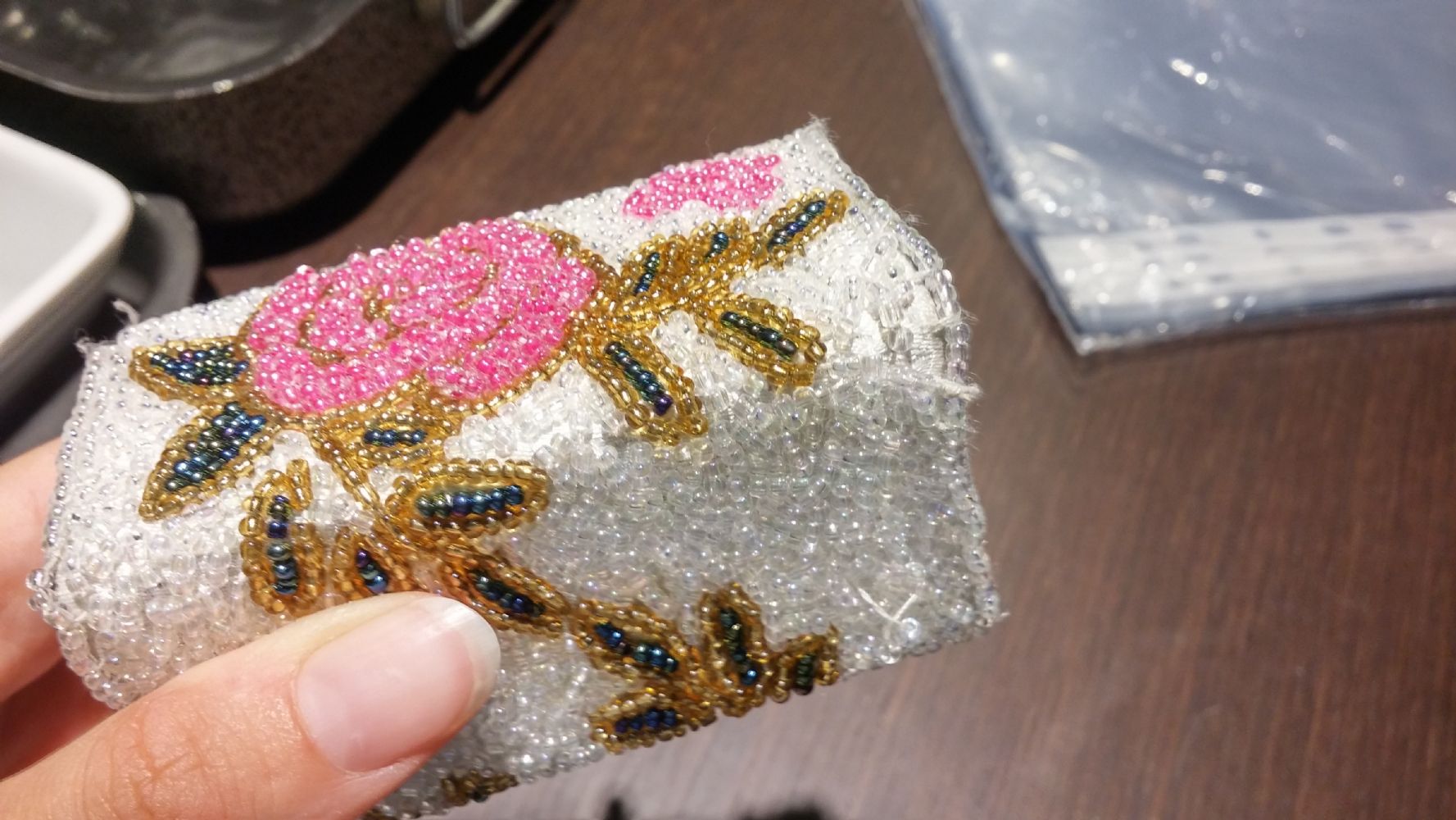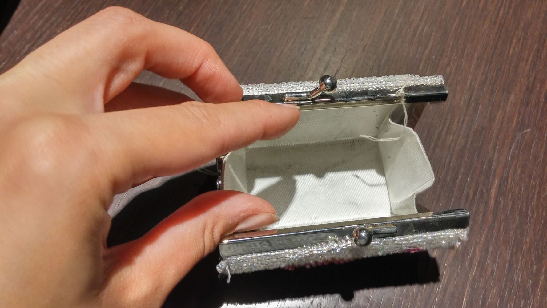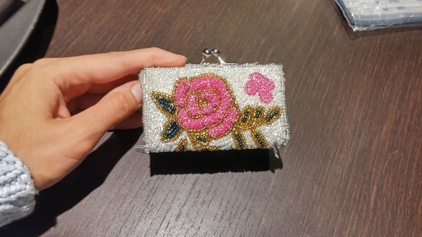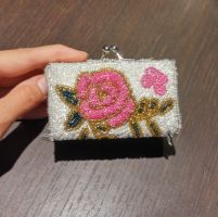 Descrizione:portamonete rigido con ricamo esterno a perline decorazione a fiore. si apre e chiude con una clip, ha forma rettangolare. ha alcune perline che sono venute via ma è ancora funzionale e per chi sa cucire può essere riparato