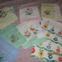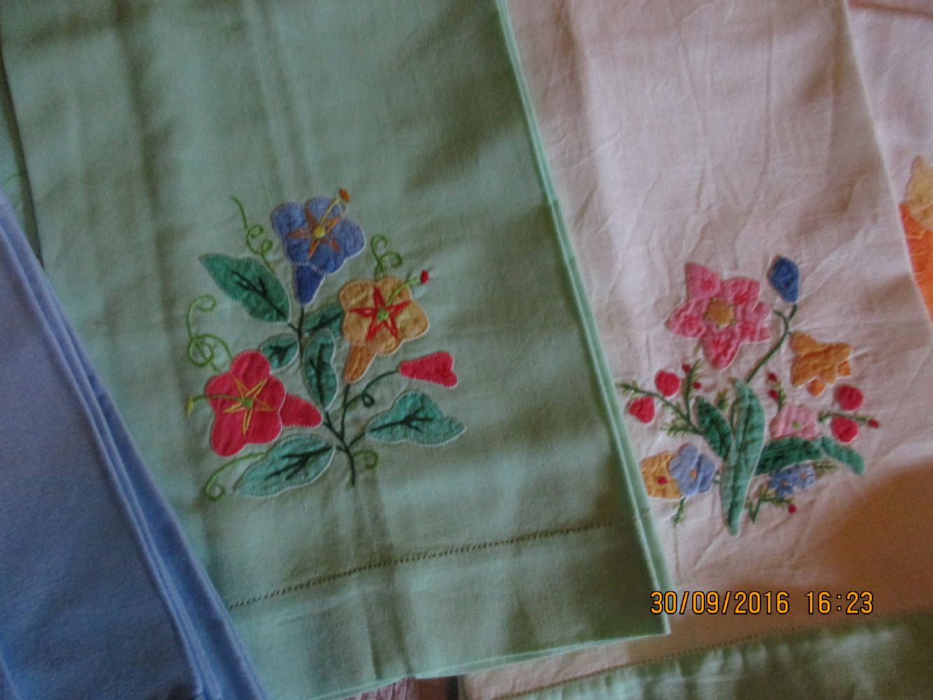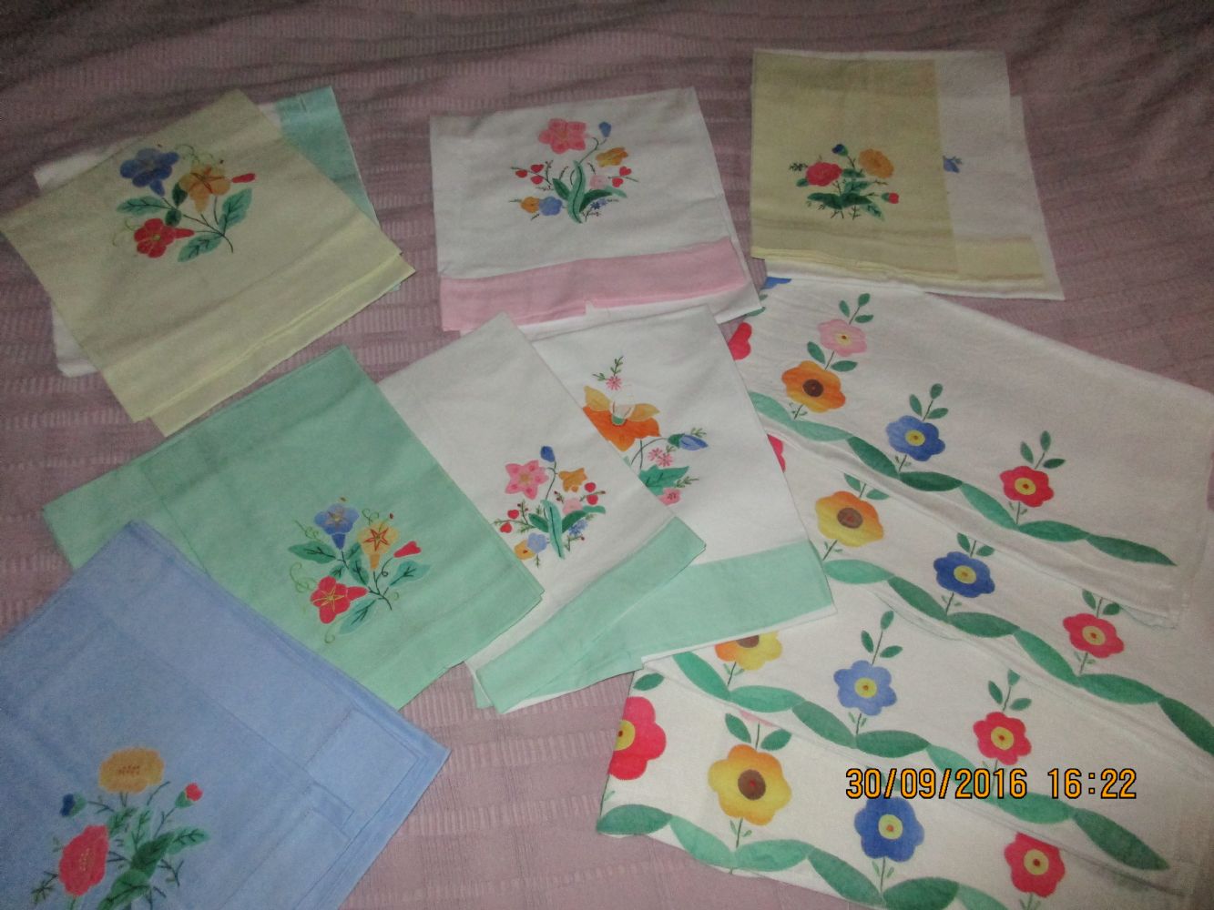 allora partendo da sinistra quella azzurra è 1 coppia viso e ospite, idem quelle 2 a fianco verde e chiara con bordo verde.in alto a dx c'è un altro viso + ospite in giallo e un altro ospite in giallo tutto a sx (sotto c'è una federe per guanciale con bordo verde). quello chiaro con il bordo rosa è da viso ed è solo. in basso a dx ci sono 4 asciugamani più grandini.. sicuramente 1ha il bordo scucito.