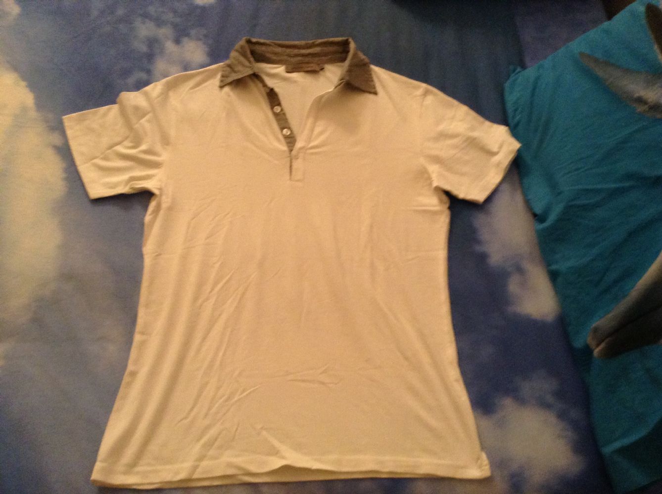 Polo uomo ,taglia xl , bianca con colletto a righine ,bianche e blu !