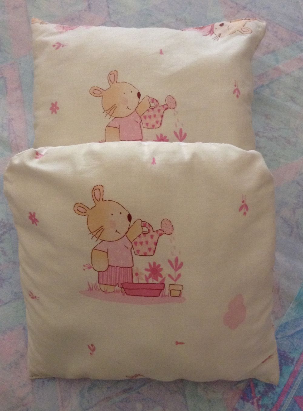 Due cuscini piccolissimi cm 20x20 circa, cuciti a mano, morbidissimi, mai usati e appena lavati