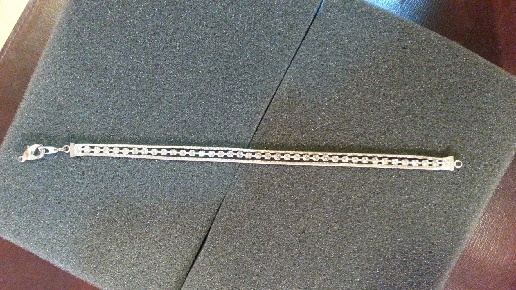 Descrizione:Bracciale bigiotteria a tre file , 9 cm. ATTENZIONE si deve riparare l'anellino per congiungere il moschettone di chiusura.