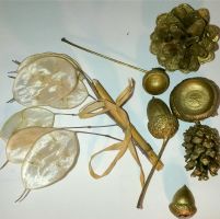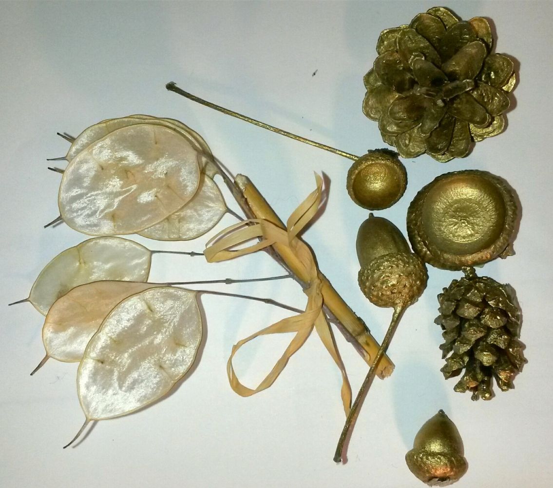 Descrizione:Pigne e ghiande dorate, per riuso creativo.