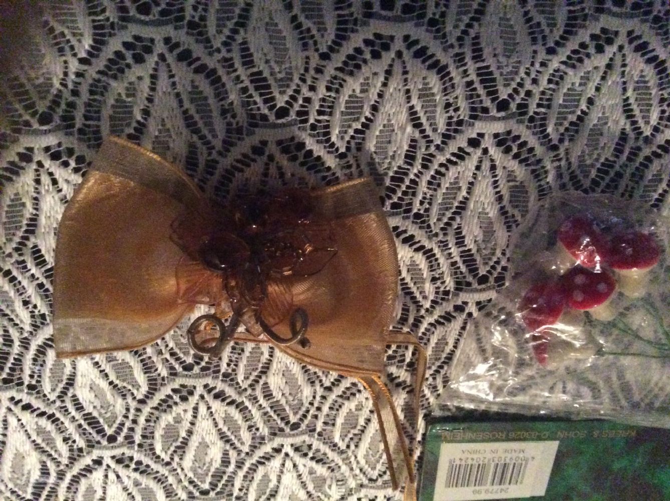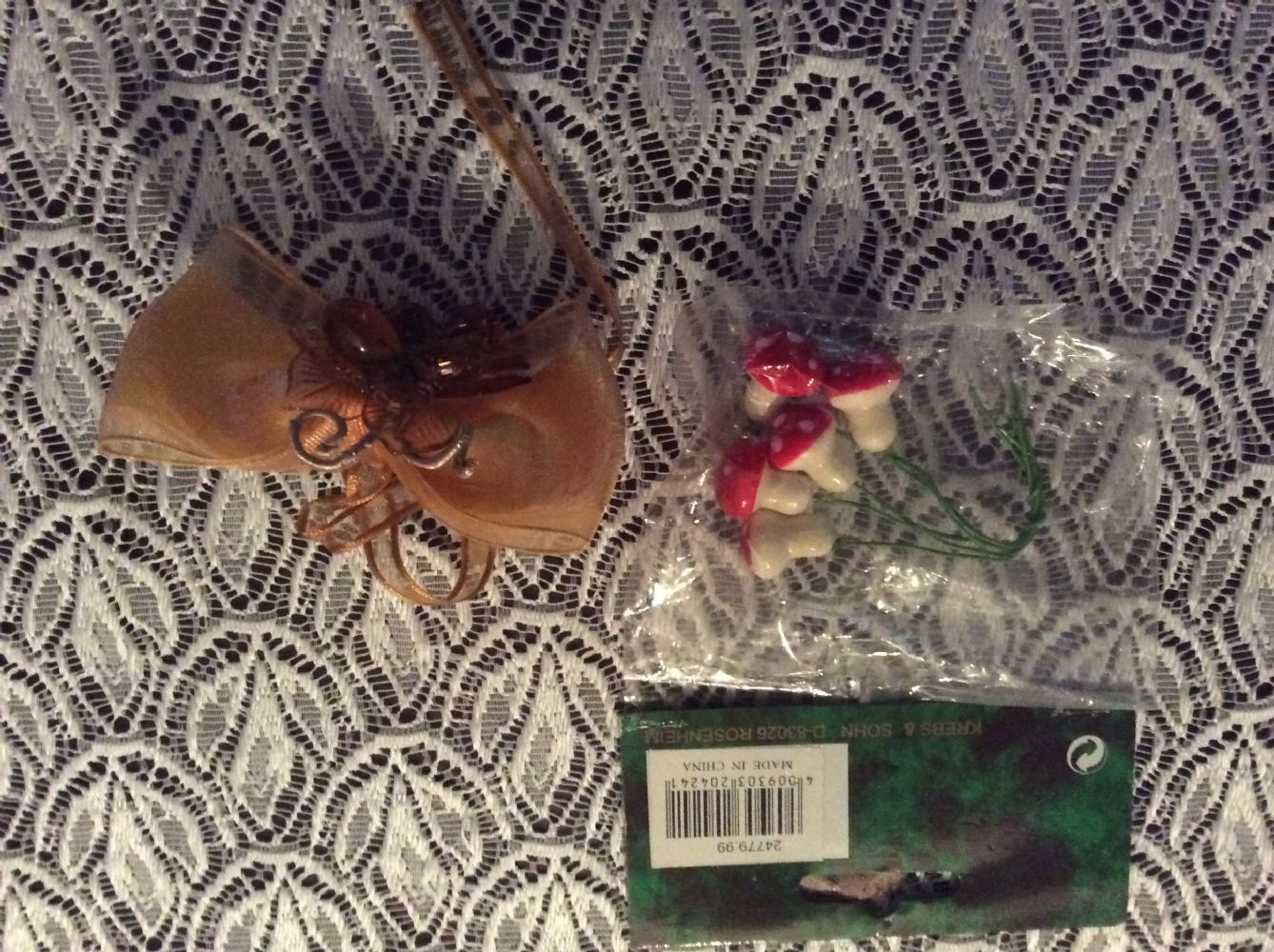 Descrizione:Sacchettino con 5 funghetti da composizione , confezione ancora chiusa +fiocco in organza color cipria con fiore di vetro color ambra, costituito da più petali . Il fiocco era una bomboniera, il fiore si può scomporre.