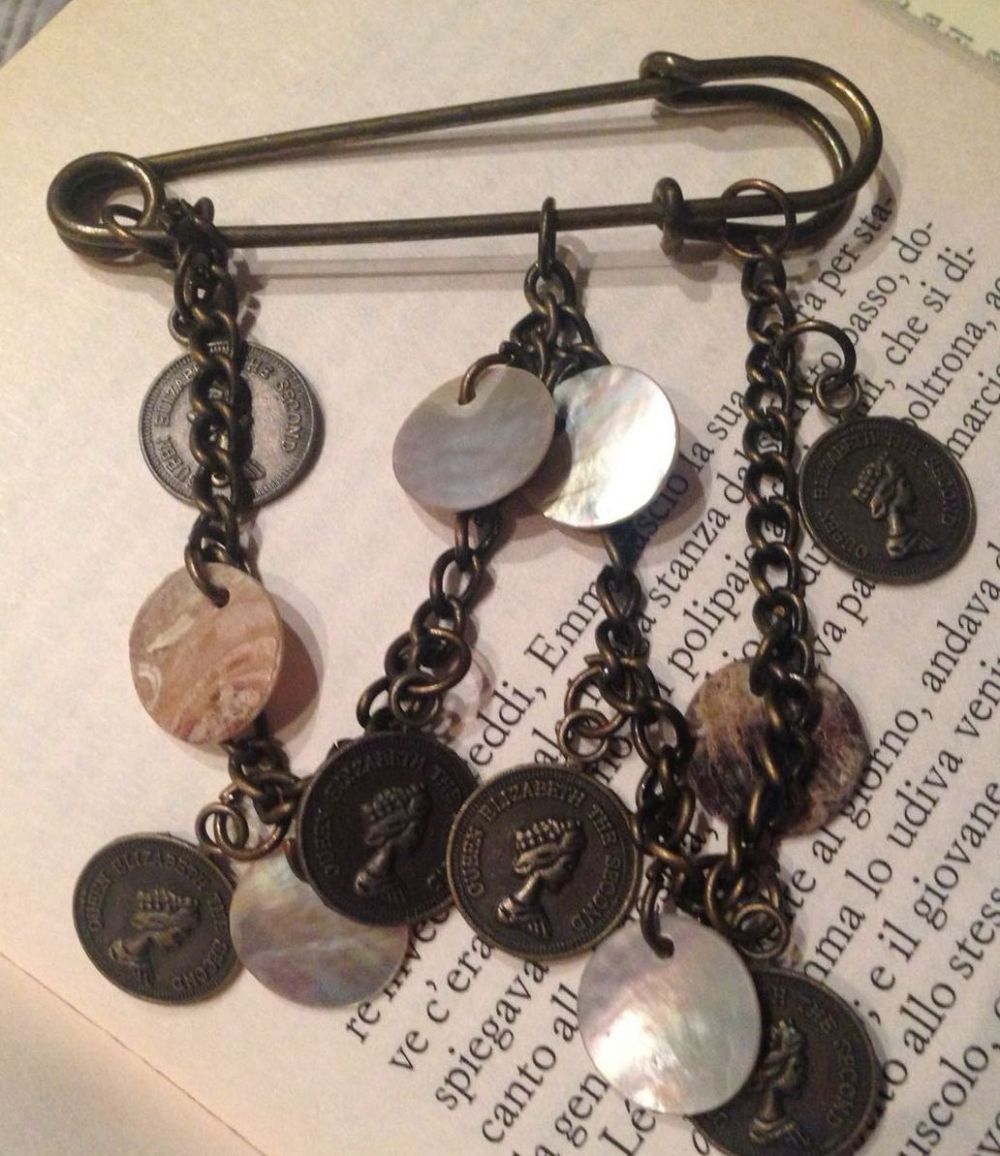 spilla in metallo brunito con monete e ciondolini di madreperla.