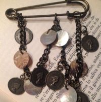 Descrizione:spilla in metallo brunito con monete e ciondolini di madreperla.