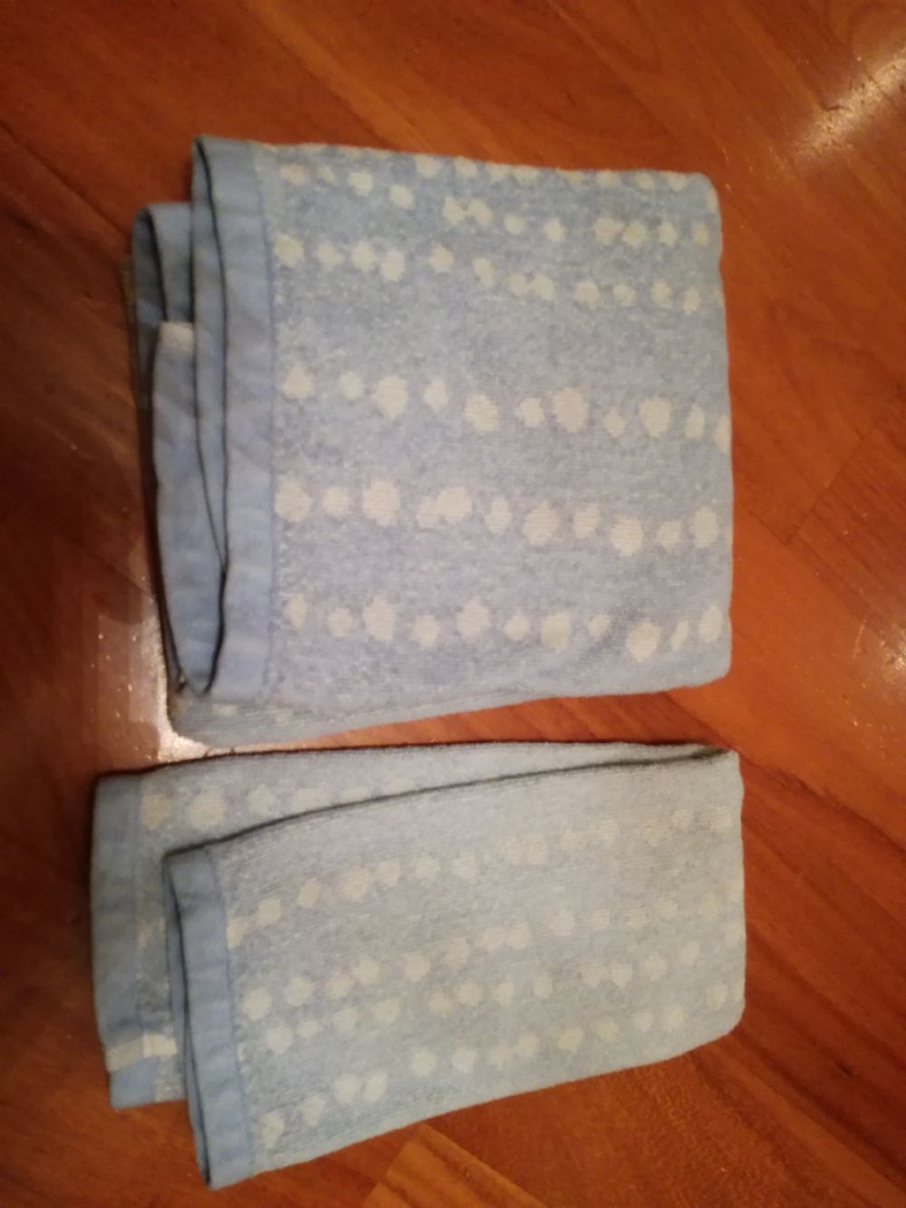 Set asciugamani viso e ospite celeste e bianco usati tanto ma ancora sfruttabile. Quello piccolo nel retro è scurito dai lavaggi. Cotone Croff Coincasa
