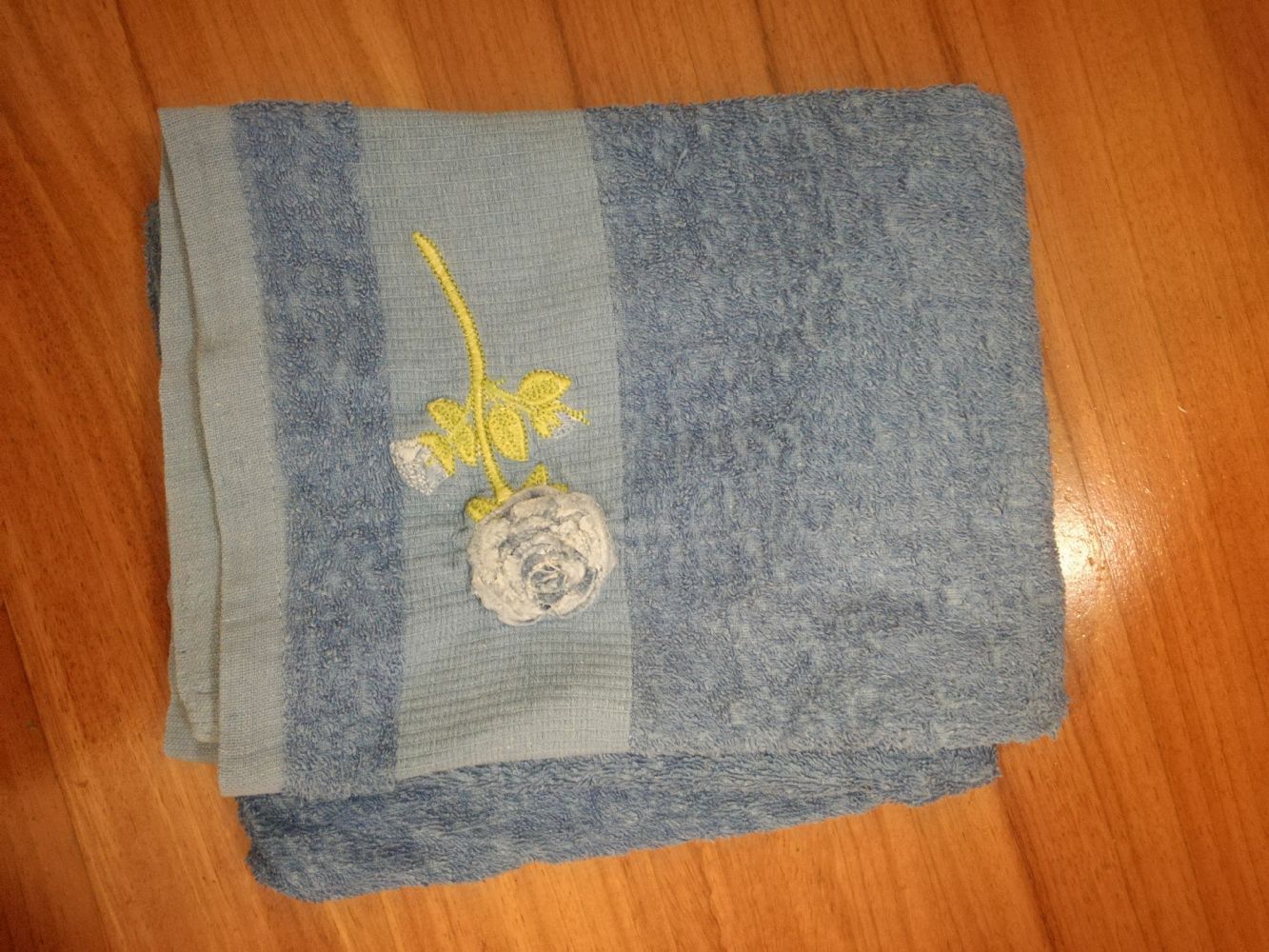 Asciugamani da viso usato molto ma ancora sfruttabile, ha qualche filo tirato e delle macchiette chiare (candeggina?) su un lato. Cmq si notano poco. 100% cotone