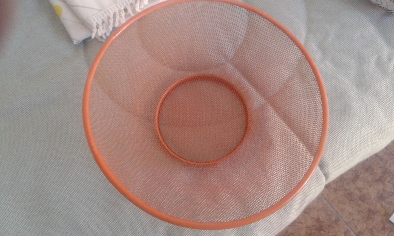 Cestino in metallo arancione. Datato piu' che usato. Intatto