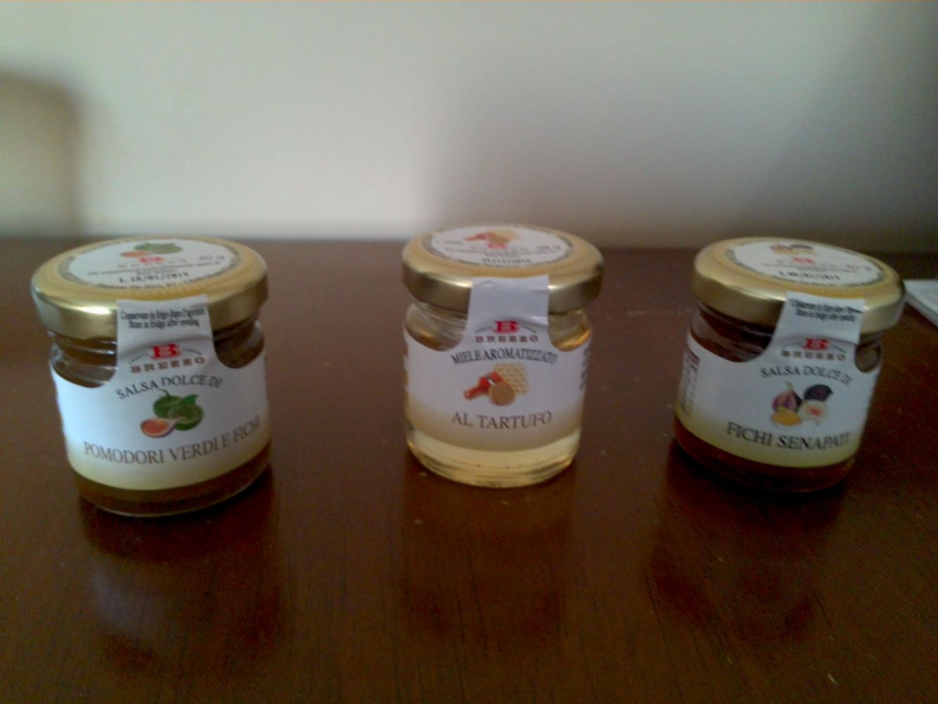 Descrizione:3 barattolini in vetro da 40gr contenenti marmellatine da gustare con i formaggi: salsa dolce di pomodori verdi e fichi, miele al tartufo e salsa dolce ai fichi senapati con scad tutti nel 2019