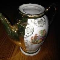 Descrizione:non ha il coperchio e mi piacerebbe tanto trovarne uno che si adatti. Osservando l'imboccatura, il diametro massimo del coperchio dovrebbe essere 6 cm. La teiera è in porcellana e ha finiture color oro lucido, tendenti all'oro rosso. Il soggetto dell'immagine è una scena di delizie agresti in abiti settecenteschi ( innamorato che suona per la dama).