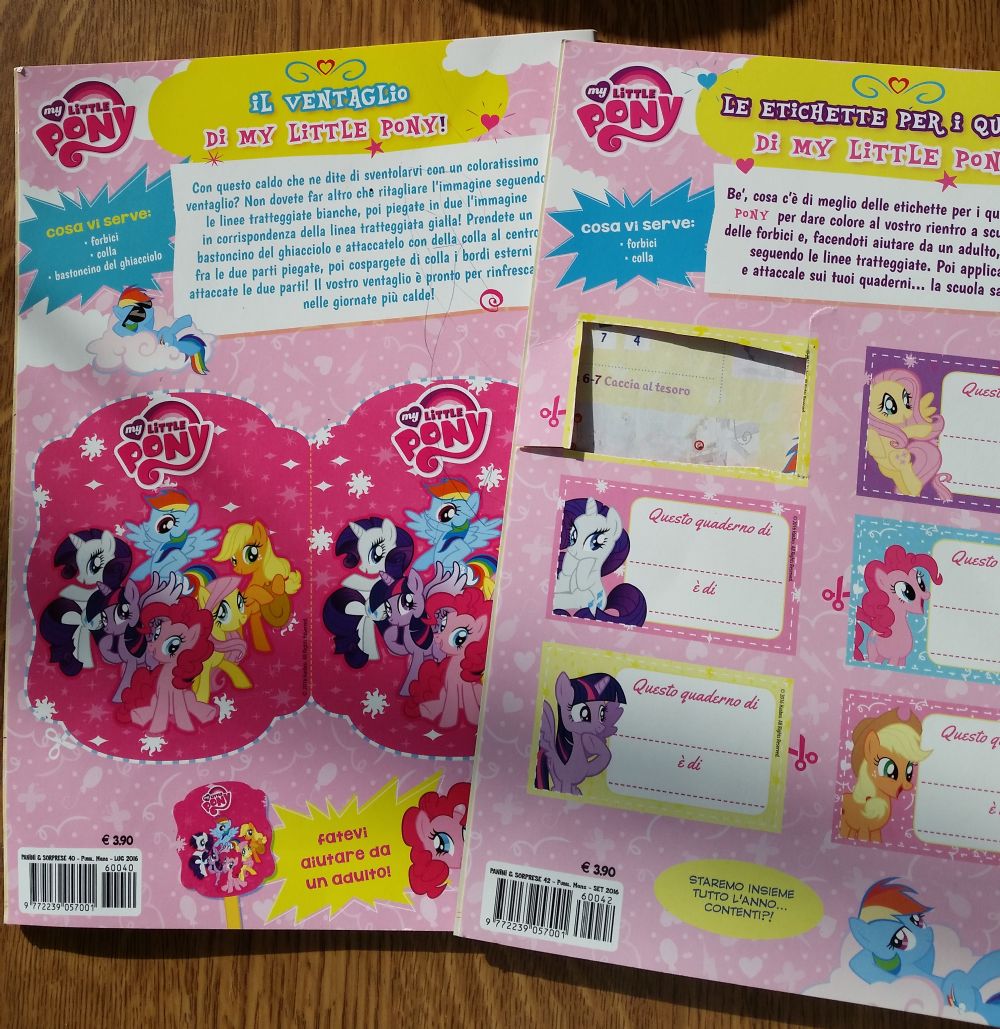 Descrizione:2 libretti MY LITTLE PONY con fumetti , giochini e pagine da colorare, Sul retro si può costruire un ventaglio o ritagliare delle etichette per i quaderni (ne manca una) n. 40 e 42 costavano 3,90 l'uno......
