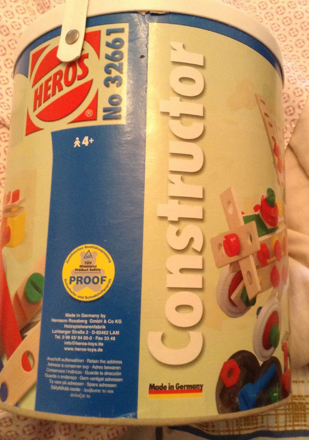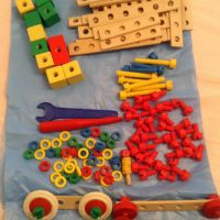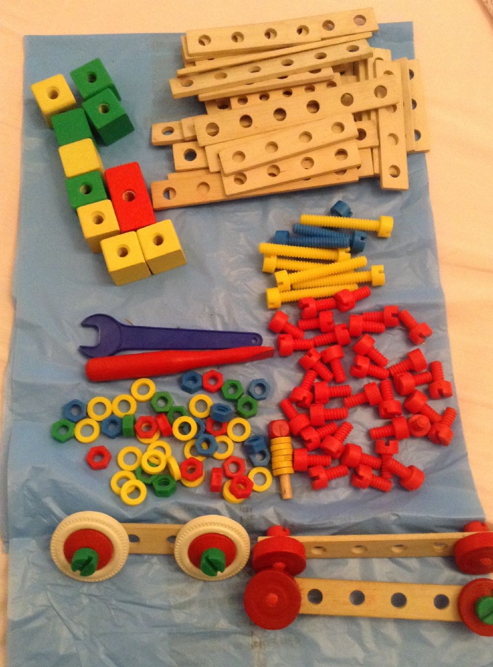 Descrizione:Fustino con circa 150 pezzi (iniziali erano 166) in legno, viti in plastica, un cacciavite e una chiave inglese