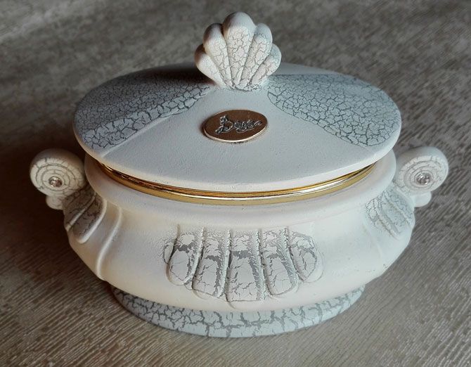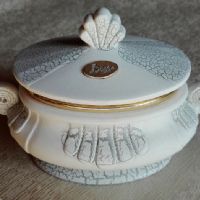 Descrizione:Grazioso porta oggetti in ceramica bianca e grigia con coperchio, manici con strass e dimensioni di cm 17x11.
