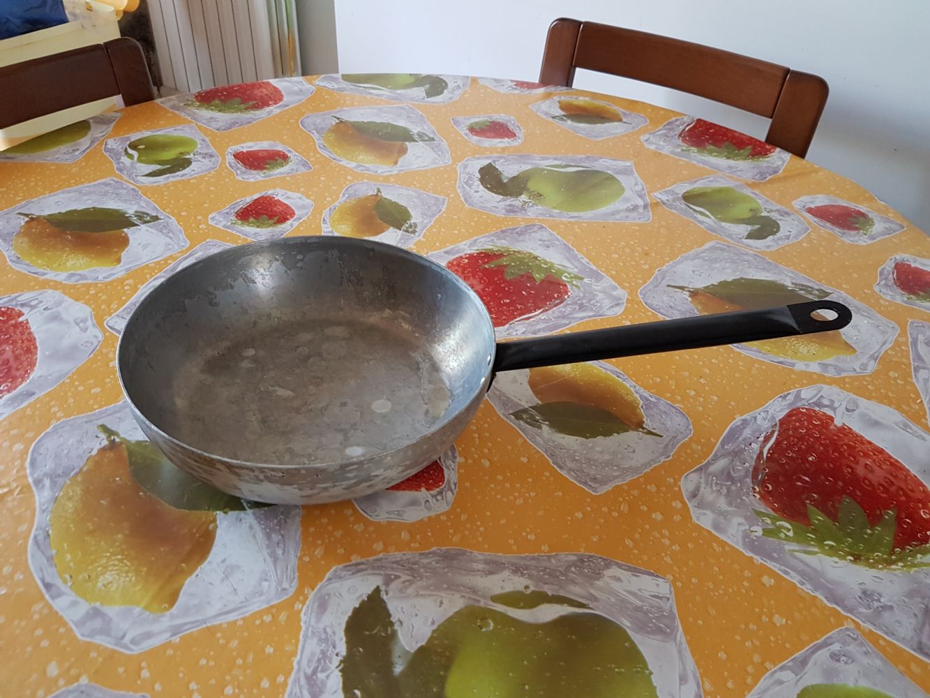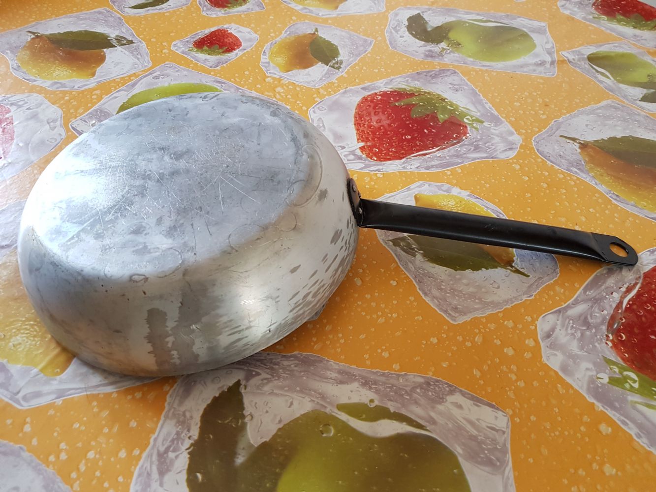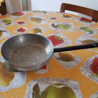 Descrizione:Padella grande (diam. 28 cm) in alluminio, con manico forato per appenderla lungo cm 26 circa.