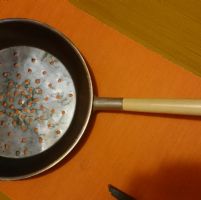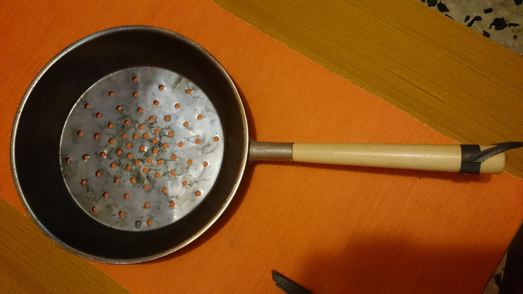 Descrizione:padella forata per cuocere le caldarroste, usata due volte, ancora perfetta. Insieme alla padella c'è anche la pinza per prendere le castagne e aprirle.