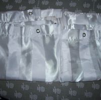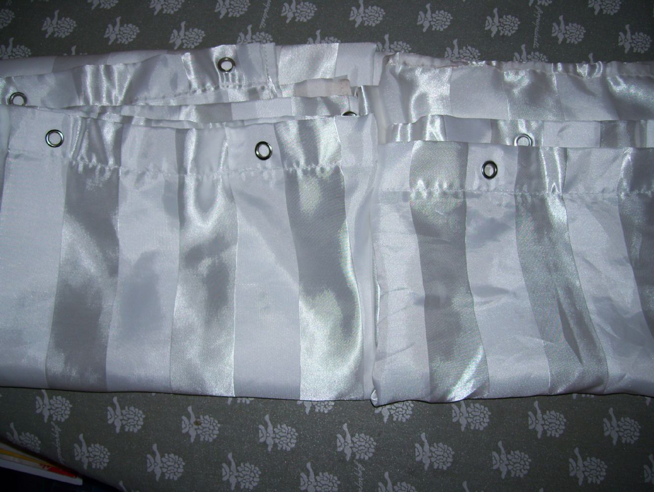 bianche tipo tessuto,no plastica,probabilmente mai usate,non mi ricordo di averle mai messe in bagno.Misure 118x170