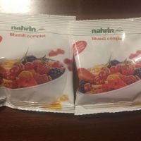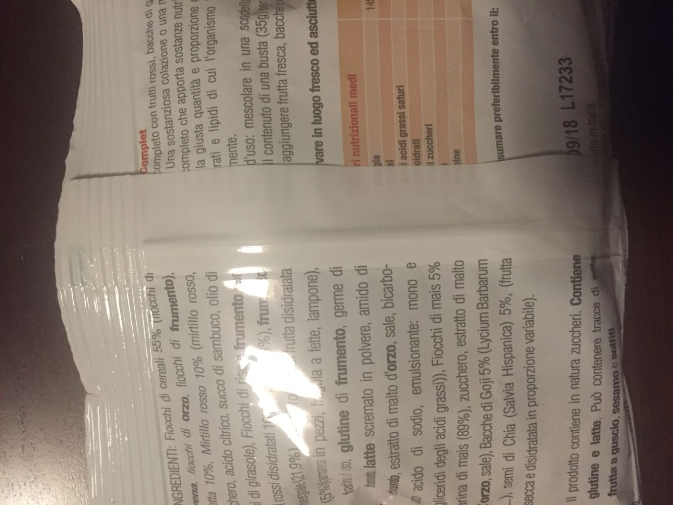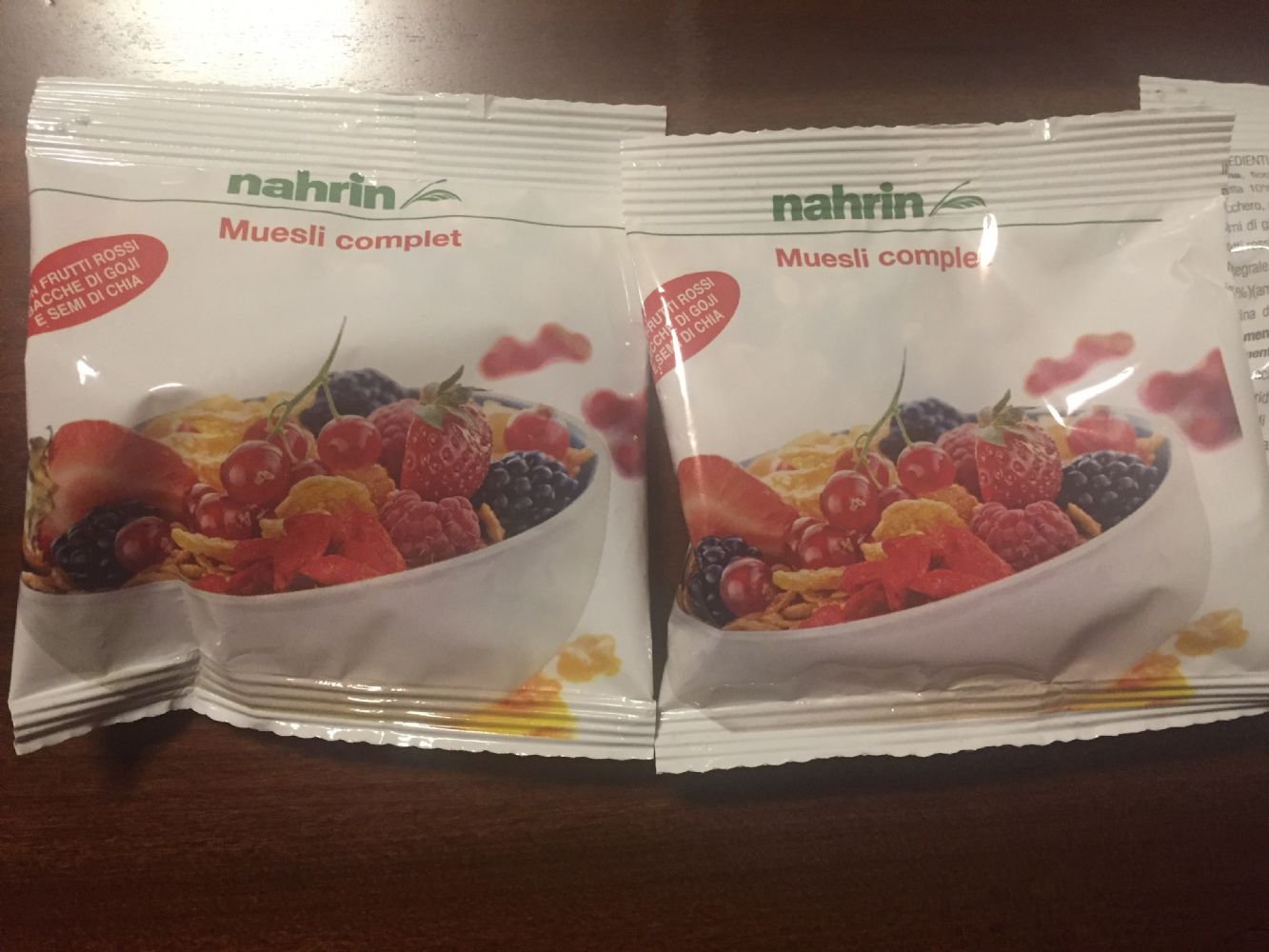 3 sacchetti muesli da 35gr, marca nahrin, con frutti rossi .. 2 confezioni scadono il 31/01/18e 1 scade il 30/09/2018.