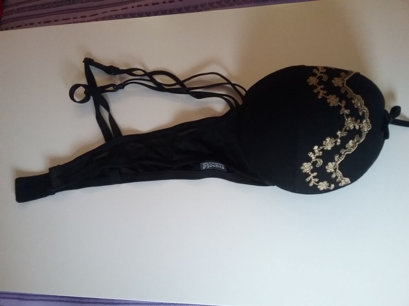 Descrizione:Reggiseno nuovo marca Fruscio. Nero con inserti dorati. Veste max una III con coppe imbottite.