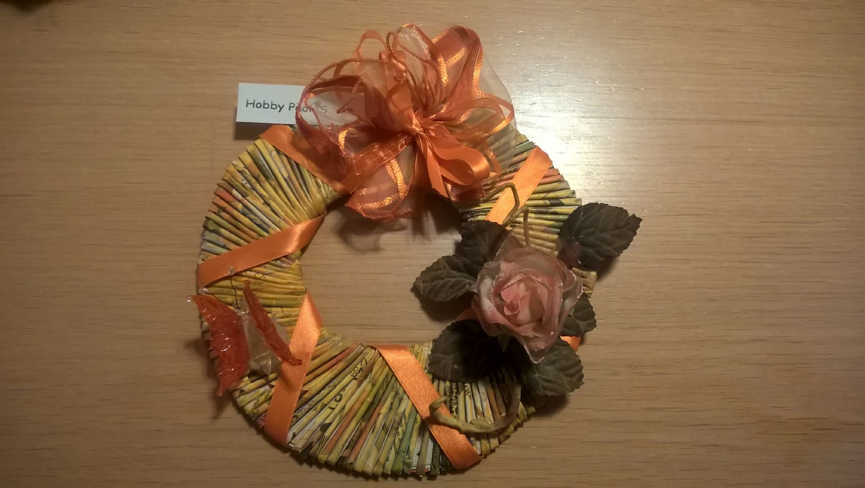 Ghirlanda fatta con cannucce di carta e decorata con nastri fiori e farfalla di vetro. Toni dell'arancione. Circa 20 cm