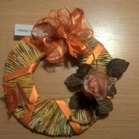 Ghirlanda fatta con cannucce di carta e decorata con nastri fiori e farfalla di vetro. Toni dell''arancione. Circa 20 cm