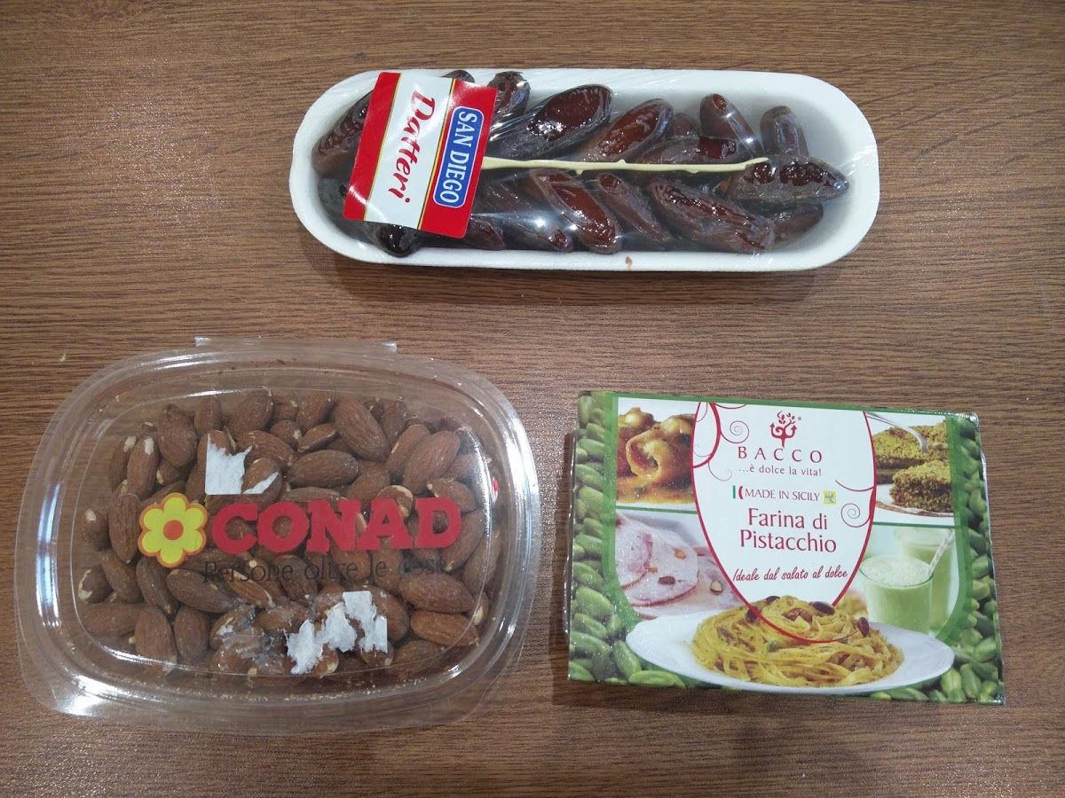 mandorle 280 gr datteri 200 gr farina di pistacchio 100 gr