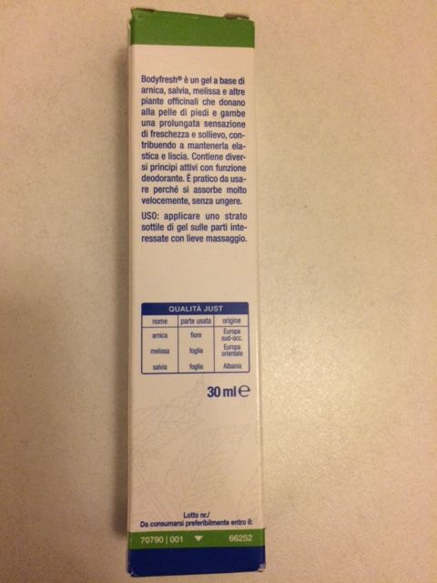 Descrizione:Crema gel bodyfresh della just "la freschezza più gradita alle gambe". Tubetto da 30ml. Da consumare preferibilmente entro il 7/2015 ma nuovo e sigillato ritengo quindi che sia integro e utilizzabile, costerebbe circa 8€ ma metto a 4c