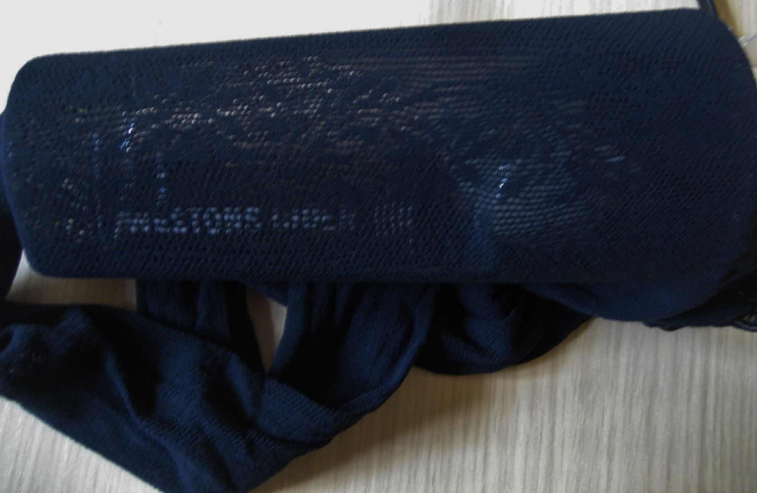 Descrizione:calze collant blu traforati con un tralcio di fiori nei lati interno ed esterno