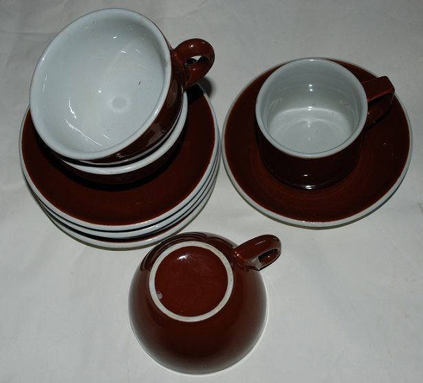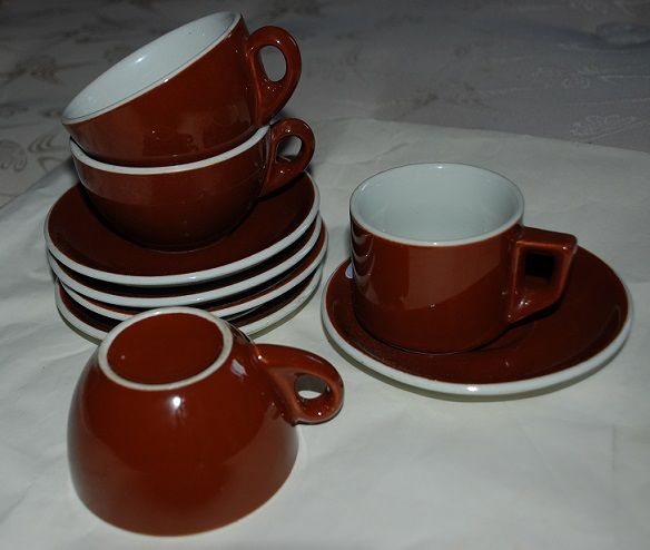 Descrizione:Tazze da caffè abbastanza grandi di colore marrone e bianco.