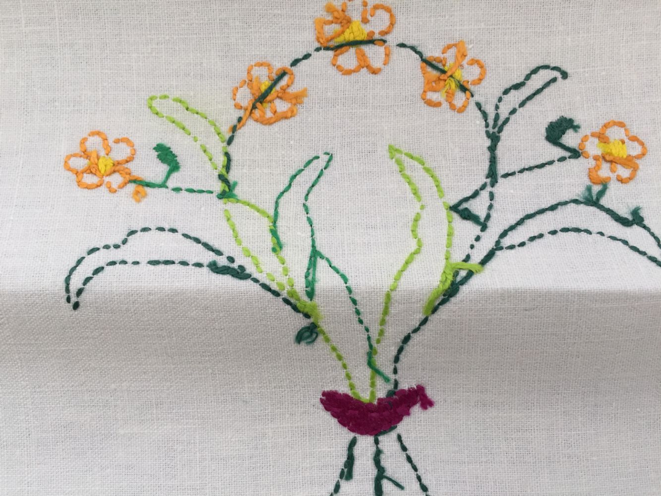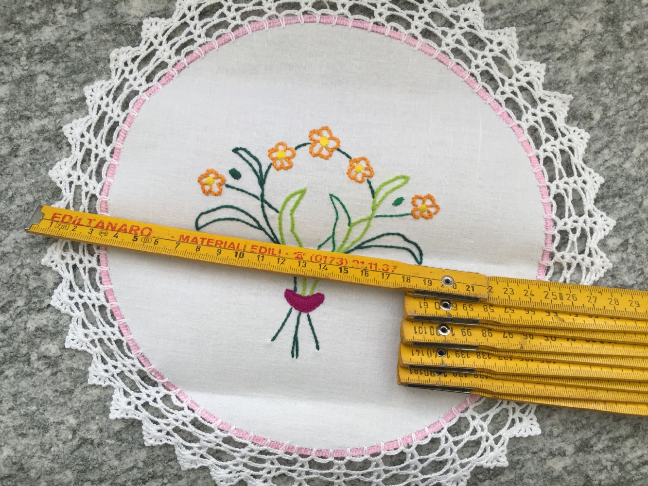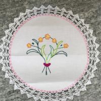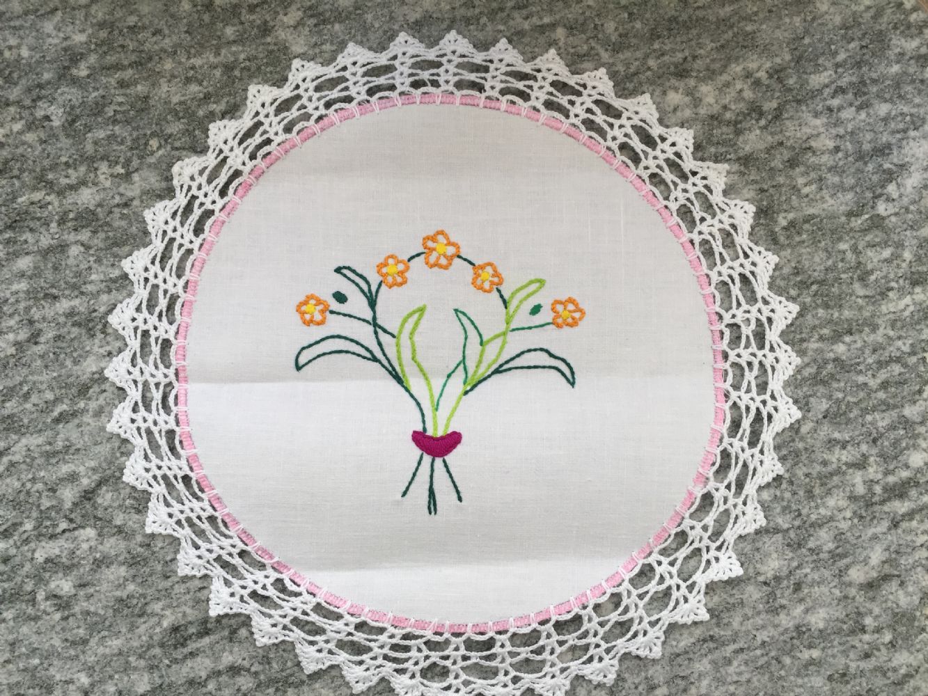 Descrizione:Centrino fatto a mano ( è un regalo di una mia cliente, ma io non lo uso), con ricamo centrale e bordo all’uncinetto . Misure in foto, la seconda foto è del retro
