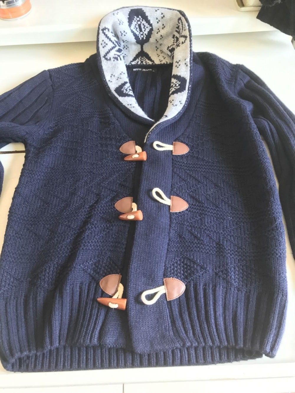 Bellissimo e nuovo, ma senza cartellino. Solo provato. Secondo me veste una 48-50. Blu con colletto bicolore. E'' davvero caldo e stupendo, perfette condizioni, preso per mio fratello ma purtroppo ho sbagliato taglia.