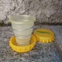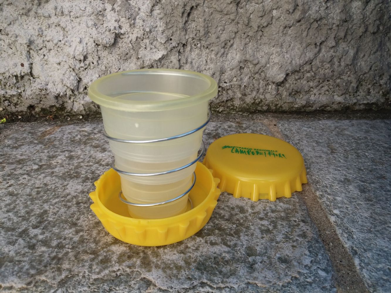 bicchiere portatile il plastica lavabile, si chiude nella scatolina e occupa pochissimo spazio