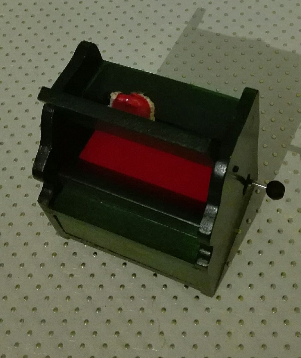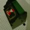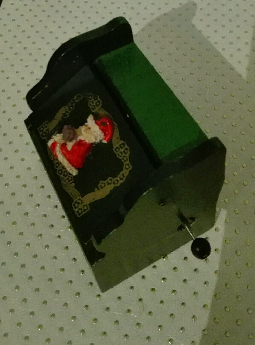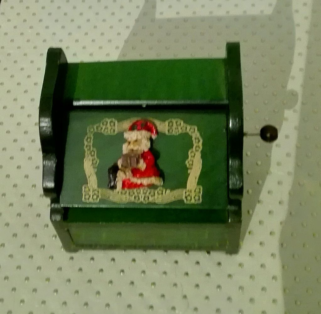 Piccolo carillon natalizio in legno, cm 8x6x8,5 (esclusa la nanovella) dipinto a mano, colore verde bosco, con melodia ovviamente natalizia e piccolo scomparto nascondi-tesori con fondo in tessuto rosso